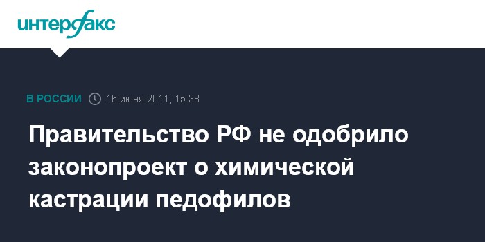 Москва. 16 июня. INTERFAX.RU - Правительство РФ дало отрицательное заключение на законопроект, предлагающий ввести химическую кастрацию для педофилов.