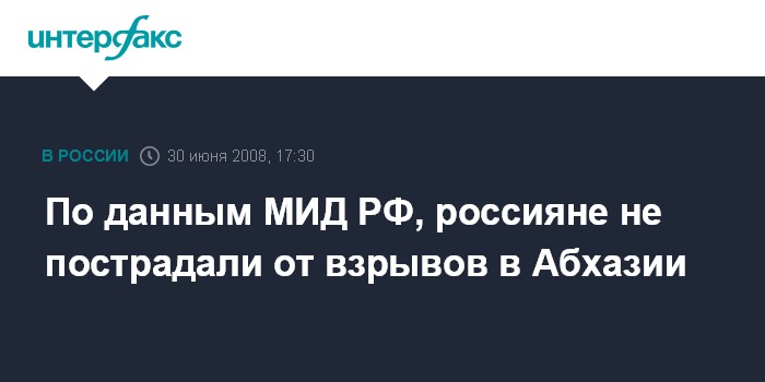 Москва. 30 июня. INTERFAX.RU - Граждане России не пострадали в результате взрывов в Абхазии. "Согласно поступающей информации, среди пострадавших нет россиян, приехавших в Абхазию на отдых", - говорится в сообщении МИД России, распространенном в понедельник.