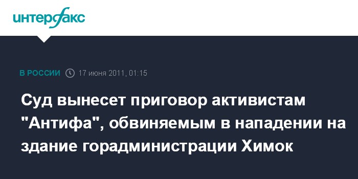 Москва. 17 июня. ИНТЕРФАКС - Химкинский городской суд в пятницу вынесет приговор активистам движения "Антифа" Алексею Гаскарову и Максиму Солопову, обвиняемым в нападении на здание администрации города.