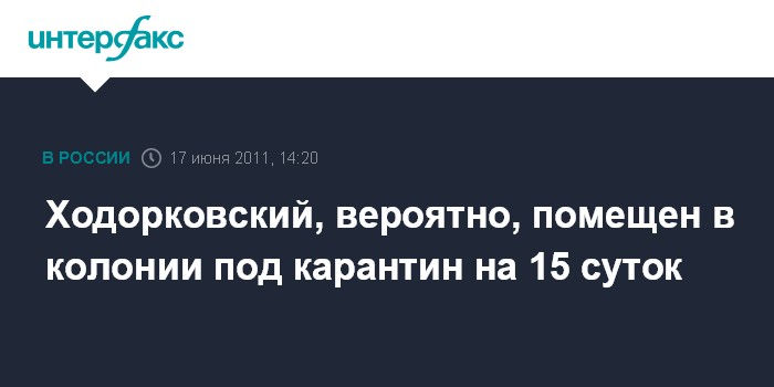 Москва. 17 июня. INTERFAX.RU - Экс-глава нефтяной компании "ЮКОС" Михаил Ходорковский, доставленный в пятницу в сегежскую исправительную колонию N7 в Карелии, по закону должен провести ближайшие две недели в медицинском изоляторе.