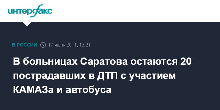 Саратов. 17 июня. INTERFAX.RU - По последним данным, в лечебных учреждениях Саратова находятся 20 человек, пострадавших в четверг в результате в крупной автоаварии, четверо из них - в тяжелом состоянии, сообщает пресс-служба регионального министерства здравоохранения.