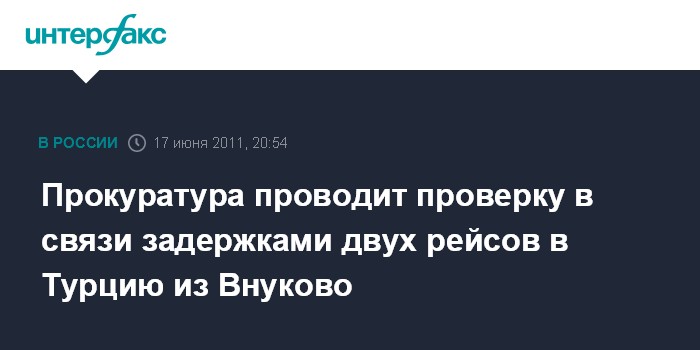 Москва. 17 июня. INTERFAX.RU - Московская межрегиональная транспортная прокуратура организовала проверку по факту задержек в пятницу вылетов двух рейсов ЗАО "Скай Экспресс" по маршруту аэропорт Внуково - Анталия (Турция), сообщила "Интерфаксу" официальный представитель Генпрокуратуры Марина Гриднева.