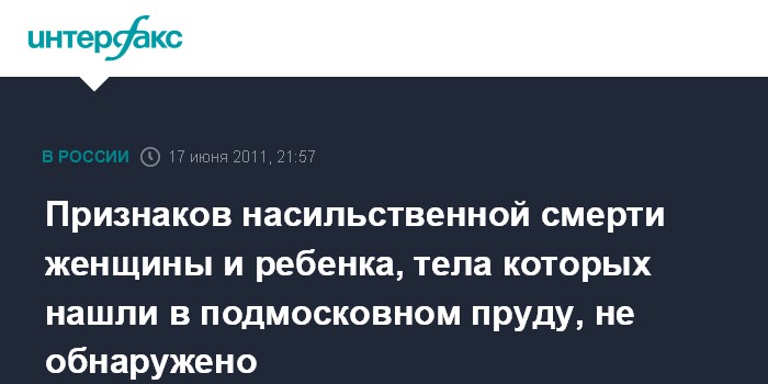 Москва. 17 июня. INTERFAX.RU - Обследование тел женщины и мальчика, обнаруженных в одном из прудов в Подмосковье, не выявило признаков, указывающих на то, что их убили, сообщили в ГСУ СКР по Московской области.