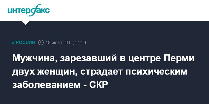 Пермь. 19 июня. ИНТЕРФАКС-ПОВОЛЖЬЕ - Мужчина, который ранил ножом двух женщин в центре Перми, страдает психическим заболеванием, сообщили в пресс-службе СКР по Пермскому краю.