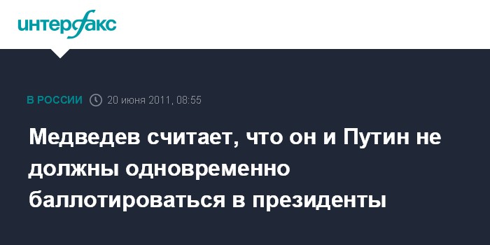 Москва. 20 июня. INTERFAX.RU - Президент России Дмитрий Медведев отвергает возможность того, что и он, и премьер Владимир Путин выставят свои кандидатуры на президентских выборах.