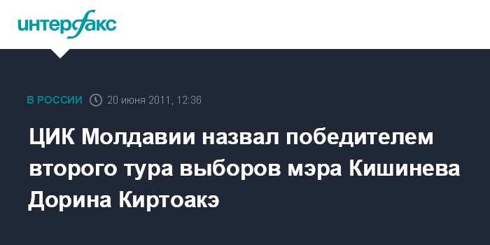 Кишинев. 20 июня. INTERFAX.RU - Центризбирком Молдавии подтвердил победу действующего мэра Кишинева Дорина Китоакэ во втором туре выборов, который состоялся 19 июня.
