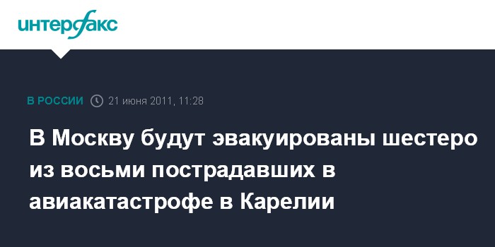 Москва. 21 июня. INTERFAX.RU - В Москву из Петрозаводска для продолжения лечения будут доставлены шестеро пострадавших в авиакатастрофе.