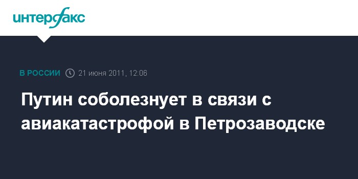 Москва. 21 июня. INTERFAX.RU - Премьер-министр РФ Владимир Путин выразил соболезнования родным и близким погибших в результате авиакатастрофы самолета ТУ-134 в Петрозаводске, сообщила во вторник пресс-служба правительства РФ.