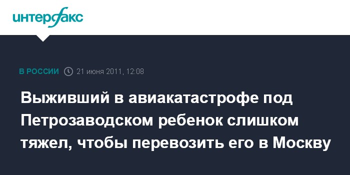 Москва. 21 июня. INTERFAX.RU - Состояние ребенка, выжившего в авиакатастрофе под Петрозаводском, не позволяет транспортировать его в Москву, сообщила глава Минздравсоцразвития Татьяна Голикова.