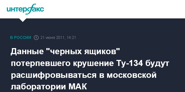 Москва. 21 июня. INTERFAX.RU - Расшифровка бортовых самописцев с разбившегося под Петрозаводском лайнера Ту-134 будет проводиться в лаборатории Межгосударственного авиационного комитета (МАК) в Москве.