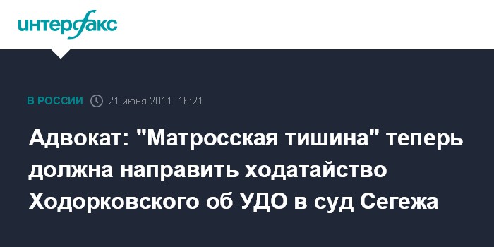 Москва. 21 июня. INTERFAX.RU - Ходатайство об условно-досрочном освобождении экс-главы НК "Юкос" Михаила Ходорковского должно быть направлено "Матросской тишиной" в суд карельского города Сегежа и рассмотрено там.