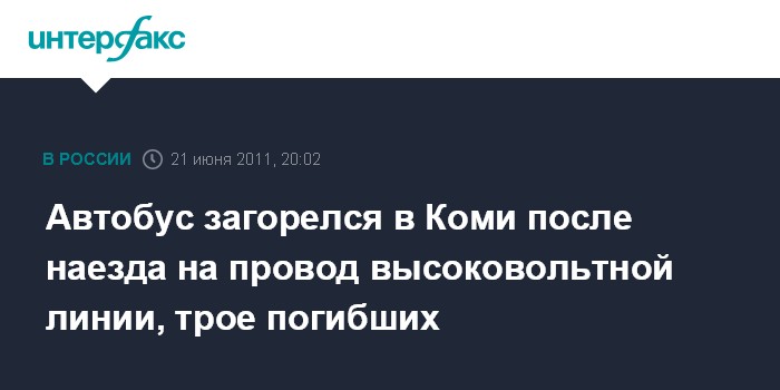 Сыктывкар. 21 июня. INTERFAX.RU - Рейсовый автобус наехал в Коми на провод высоковольтной линии электропередачи, три человека погибли.