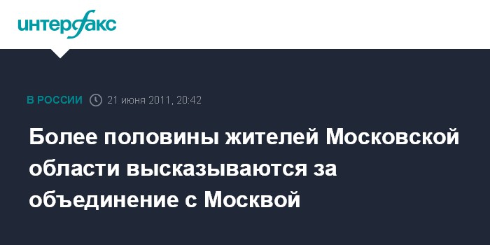 Москва. 21 июня. INTERFAX.RU - Более половины жителей Подмосковья поддерживают идею объединения столицы с областью. По результатам проведенного Исследовательским центром рекрутингового портала Superjob.ru исследования, за объединение с Москвой высказались 56% жителей области и только 37% москвичей.