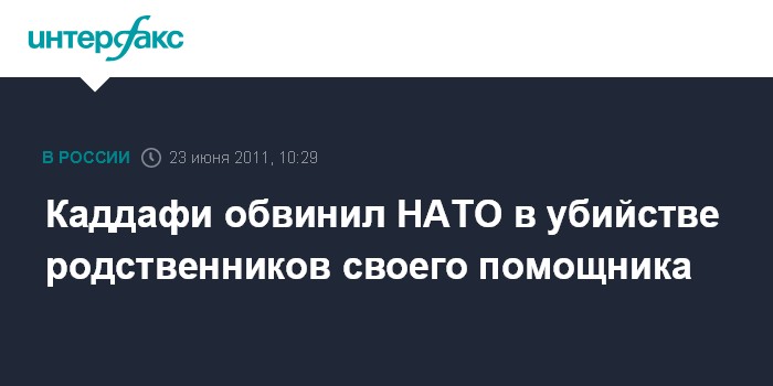 Дубай. 23 июня. INTERFAX.RU - Ливийский лидер Муамар Каддафи обвинил натовскую авиацию в убийстве членов семьи своего помощника, сообщает государственное телевидение Ливии.