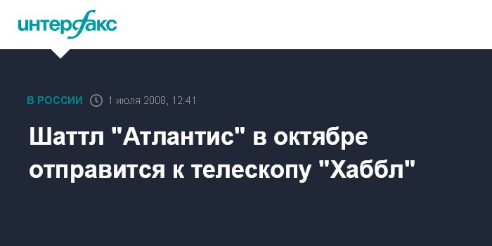 Москва. 1 июля. INTERFAX.RU - Американский шаттл "Атлантис" в октябре совершит последний полет для ремонта и технического обслуживания космического телескопа "Хаббл", сообщает НАСА. "В течение 11-суточного полета экипаж шаттла восстановит и улучшит возможности обсерватории", - говорится в сообщении, опубликованном на сайте НАСА.