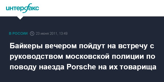 Москва. 23 июня. INTERFAX.RU - Представители сообщества мотоциклистов встретятся в четверг с руководством столичной полиции, чтобы узнать о ходе расследования обстоятельств наезда спорткара Porsche на байкера Рауфа Абзалова, сообщил активист сообщества Юрий Некрасов.