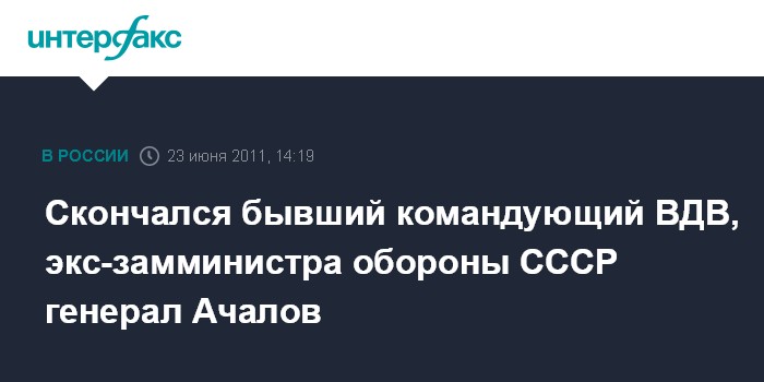 "Генерал Владислав Алексеевич Ачалов скончался после тяжелой и продолжительной болезни. Он командовал Воздушно-десантными войсками с января 1989 г. по декабрь 1990 года, был заместителем министра обороны СССР в период с декабря 1990 г. по август 1991 года", - сказал Чередник.