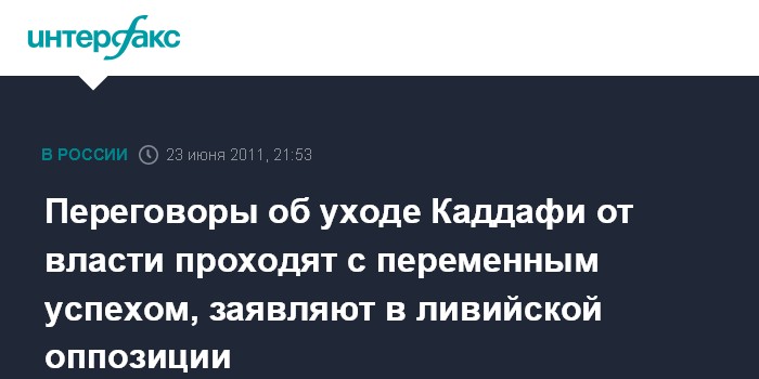 Париж. 23 июня. INTERFAX.RU - Ливийские оппозиционеры в ходе переговоров с представителями Муамара Каддафи обсуждают только вопрос о его уходе от власти, заявил в интервью французской газете Le Figaro представитель оппозиционного Национального совета Махмуд Шаммам.