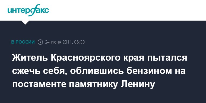 Красноярск. 24 июня. ИНТЕРФАКС-СИБИРЬ - Пьяный житель Красноярского края забрался на постамент памятника Ленину, облил себя бензином и поджег, полицейским удалось сбить пламя, сообщает пресс-служба ГУ МВД по региону в пятницу.