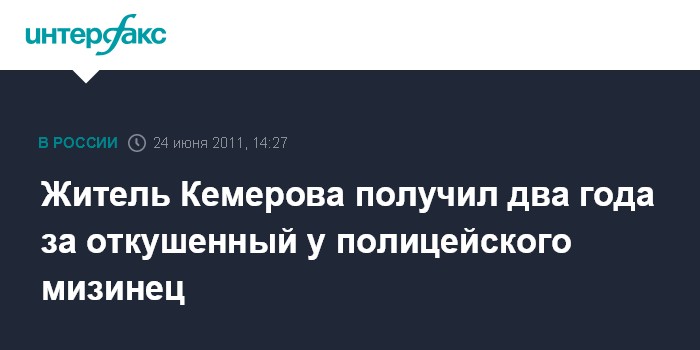 Кемерово. 24 июня. INTERFAX.RU - Кемеровский областной суд приговорил к двум годам колонии общего режима жителя Кемерово, откусившего полицейскому мизинец.