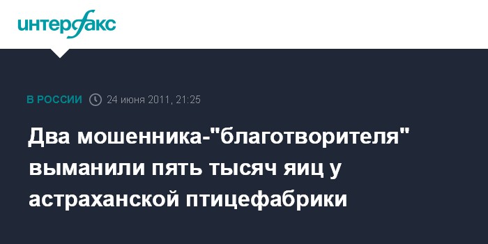 Астрахань. 24 июня. INTERFAX.RU - В Астрахани возбуждено уголовное дело в отношении двух местных жителей, которые, представившись сотрудниками Астраханской региональной общественной организации по оказанию помощи детям-инвалидам, похитили с птицефабрики 5 тыс. яиц.