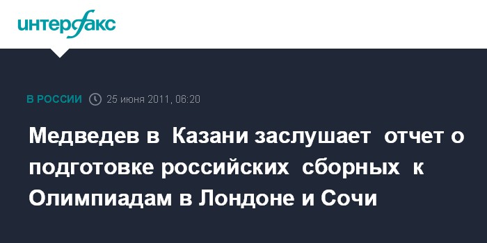 Медведев в Казани заслушает отчет о подготовке российских сборных к Олимпиадам в Лондоне и Сочи