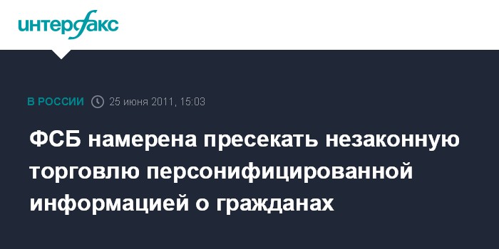 Москва. 25 июня. INTERFAX.RU - ФСБ России заявила о намерении проводить на всей территории России мероприятия по пресечению торговли базами данных, содержащими персонифицированную информацию о гражданах страны и государственную тайну.