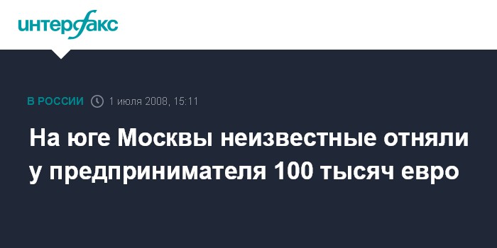 Москва. 1 июля. INTERFAX.RU - В Южном округе столицы грабители отняли у предпринимателя 100 тыс. евро, сообщил "Интерфаксу" источник в правоохранительных органах. "Сегодня на ул. Шухова, д.5 предприниматель в одном из коммерческих банков обменял 100 тыс. евро, после чего сел в автомобиль "ВАЗ-2107". Позже неизвестные стали преследовать машину, стрелять по колесам, а затем, угрожая оружием, отняли деньги и скрылись", - рассказал собеседник агентства.