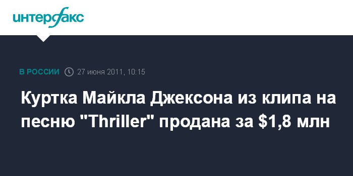 Лондон. 27 июня. INTERFAX.RU - Кожаная крутка Майкла Джексона, в которой певец в 1983 году снялся в знаменитом клипе "Thriller", была продана за $1,8 млн на аукционе Julien's Auction в Калифорнии, сообщает в понедельник британская телерадиокорпорация BBC.