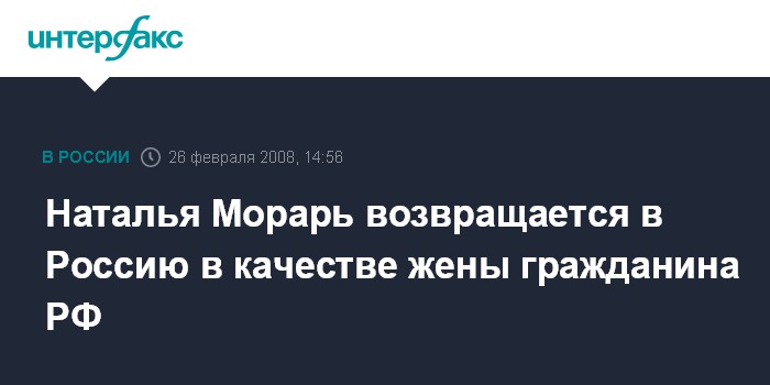 Москва. 26 Февраля. INTERFAX.RU - Корреспондент журнала "The New Times", гражданка Молдавии Наталья Морарь, которой ранее был предъявлен запрет на въезд на территорию РФ, в среду 26 февраля намерена прилететь в Москву в качестве законной супруги гражданина России, сообщает агентство "Интерфакс". "Теперь она, как супруга российского гражданина, автоматически получает право на жительство по месту, где прописан ее муж, то есть я", - заявил сочетавшийся с Натальей законным браком журналист "The New Times" Илья Барабанов.