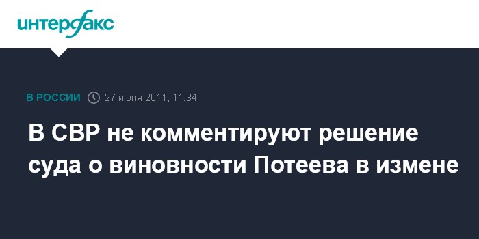 Москва. 27 июня. INTERFAX.RU - В Службе внешней разведки (СВР) РФ воздержались от каких-либо комментариев по решению Московского окружного военного суда, признавшего виновным в госизмене полковника разведки Александра Потеева, выдавшего США группу российских "нелегалов".