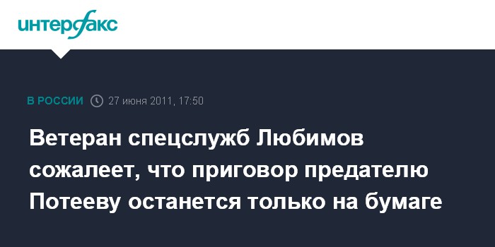 Москва. 27 июня. INTERFAX.RU - Ветеран спецслужб Михаил Любимов считает приемлемым приговор бывшему полковнику разведки Александру Потееву, выдавшему США группу российских нелегалов, но сожалеет, что его не удастся реализовать.