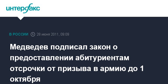 Москва. 28 июня. INTERFAX.RU - Президент России Дмитрий Медведев подписал Федеральный закон "О внесении изменения в статью 24 Федерального закона "О воинской обязанности и воинской службе", сообщает во вторник пресс-служба Кремля.