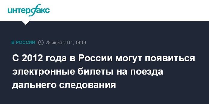 Москва. 28 июня. INTERFAX.RU - Электронные билеты на поезда дальнего следования могут появиться в РФ с 1 января 2012 г.: проект соответствующего приказа размещен на сайте министерства транспорта (Минтранс) РФ.