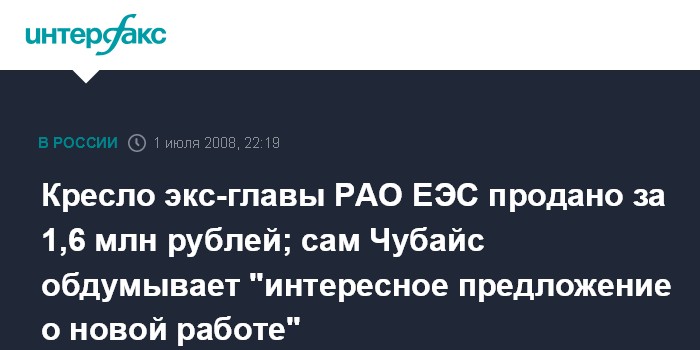 Кресло экс-главы РАО ЕЭС продано за 1,6 млн рублей; сам Чубайс обдумывает "интересное предложение о новой работе"