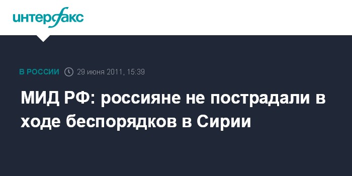 Москва. 29 июня. INTERFAX.RU - Россиян, по данным на среду, нет среди пострадавших в результате столкновений в Дамаске.