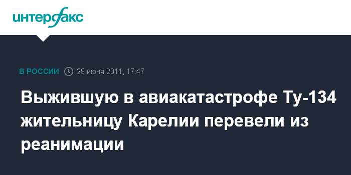 Выжившую в авиакатастрофе Ту-134 жительницу Карелии перевели из реанимации