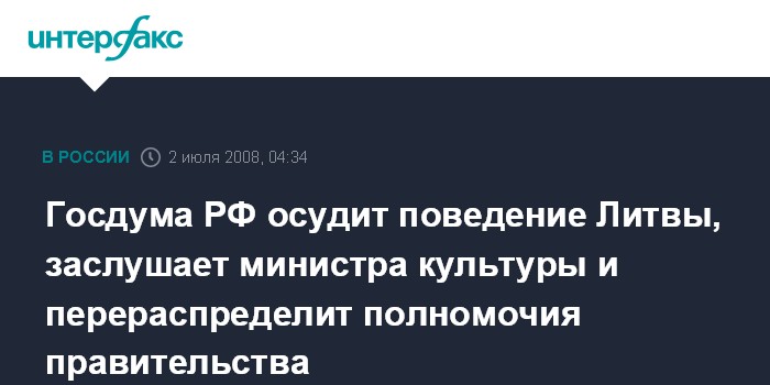 Москва. 2 июля. ИНТЕРФАКС - Госдума в среду собирается принять заявление "О действиях властей Литовской Республики, направленных на ухудшение российско-литовских отношений".