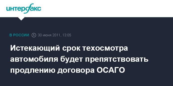 Москва. 30 июня. INTERFAX.RU - Договор ОСАГО не будет заключаться, если до истечения срока действия талона техосмотра автомобиля осталось менее 6 месяцев. О таких изменениях в процедуру заключения договора ОСАГО после вступления в силу нового порядка проведения техосмотра автомобилей с начала 2012 года сообщил президент Российского союза автостраховщиков (РСА) Павел Бунин журналистам в четверг.