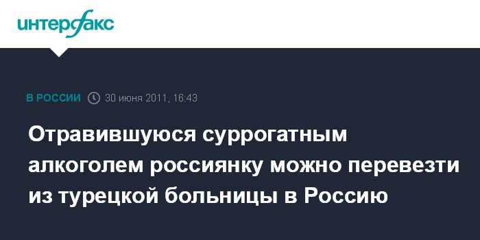 Москва. 30 июня. INTERFAX.RU - Турецкие врачи не видят препятствий для возвращения на родину россиянки, отравившейся некачественным алкоголем на яхте близ Бодрума и впавшей в кому.