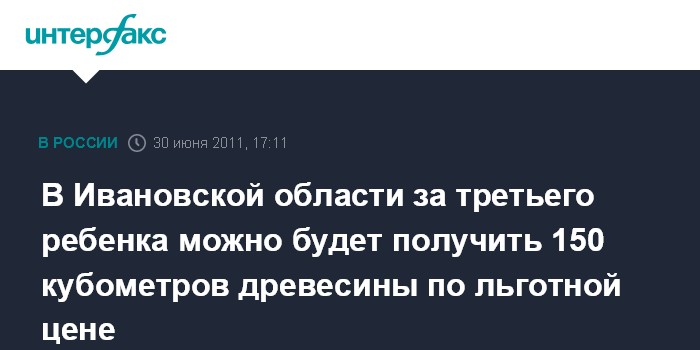 Иваново. 30 июня. INTERFAX.RU - Депутаты Ивановской областной Думы в четверг приняли закон о предоставлении на льготных условиях древесины семьям при рождении третьего ребенка, передает корреспондент "Интерфакса".