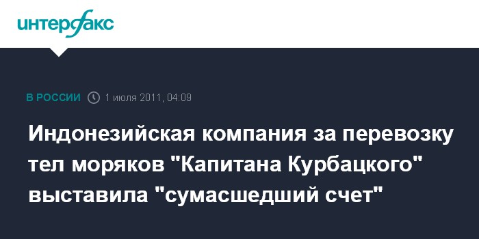 "К сожалению, местная компания, отвечающая за действия, связанные с трагедией, в том числе за отправку тел в Россию, решила заработать на этом деле сколько можно, и поспешила выставить сумасшедшие счета, далеко выходящие за рамки как разумности, так и элементарного приличия", - сообщает в пятницу издание Морской бюллетень "Совфрахт" со ссылкой на представителя судовладельца, который находится в Индонезии.