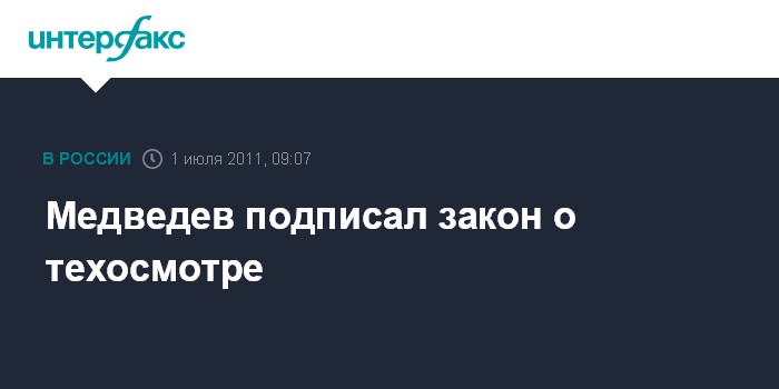 Москва. 1 июля. INTERFAX.RU - Президент России Дмитрий Медведев подписал федеральный закон "О техническом осмотре транспортных средств и о внесении изменений в отдельные законодательные акты Российской Федерации", сообщает в пятницу пресс-служба Кремля.