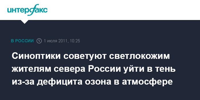 Синоптики советуют светлокожим жителям севера России уйти в тень из-за дефицита озона в атмосфере