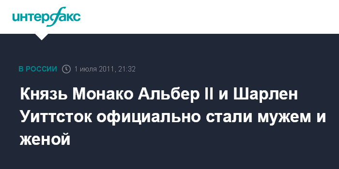 Монако. 1 июля. INTERFAX.RU - Князь Монако Альбер II и бывшая чемпионка по плаванию из ЮАР Шарлен Уиттсток сочетались браком, сообщает агентство EFE.
