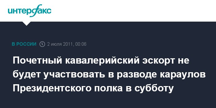 Москва. 2 июля. ИНТЕРФАКС - Церемония развода караулов Президентского полка пройдет в субботу без участия Почетного кавалерийского эскорта.