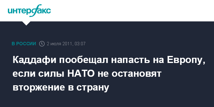 Лондон. 2 июля. ИНТЕРФАКС - Ливийский лидер Муаммар Каддафи заявил, что если НАТО не прекратит бомбардировки территории Ливии, то его армия может попытаться перенести боевые действия в Европу.