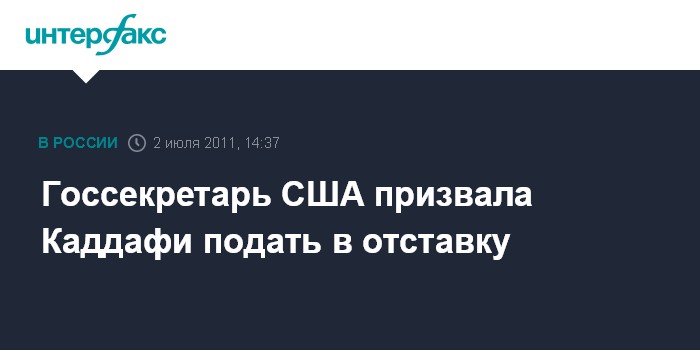 Мадрид. 2 июля. INTERFAX.RU - Госсекретарь США Хиллари Клинтон потребовала от ливийского лидера Муамара Каддафи покинуть свой пост, сообщает агентство ЭФЭ. "Вместо того, чтобы расточать угрозы, М.Каддафи должен прежде всего заботиться о благополучии своего народа, он должен уйти в отставку и позволить осуществить демократические преобразования, в которых нуждается население Ливии", - сказала Х.Клинтон на совместной с главой МИД Испании Тринидад Хименес пресс-конференции в Мадриде.