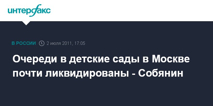 Москва. 2 июля. INTERFAX.RU - Мэр Москвы Сергей Собянин заявляет о практически полной ликвидации очередей в столичные детские сады. "Осенью 2010 года в очереди стояло 25 тысяч детей. На сегодняшний день она практически полностью ликвидирована", - сказал он, выступая на 14-ой отчетно-выборной конференции московского городского регионального отделения партии "Единая Россия" в субботу. По его словам, тысячи молодых мам смогли устроить своих детей в дошкольное учреждение и вернуться к трудовой деятельности, либо продолжить учебу.