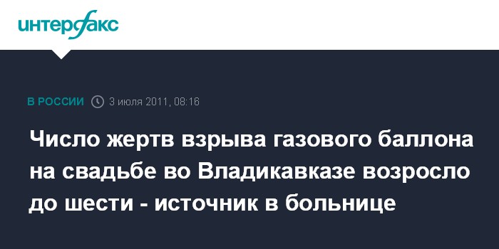 Газовый баллон взорвался 25 июня во дворе частного дома во Владикавказе во время празднования свадьбы. В результате 55 человек получили ранения, в основном, ожоги. Состояние более 10 пострадавших изначально оценивалось как крайне тяжелое.